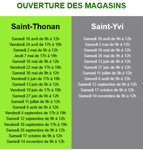 Pour tous vos besoins de matériel, venez directement dans nos magasins de St-Thonan et St-Yvi. Retrouvez toutes nos dates d’ouverture ci-dessous.